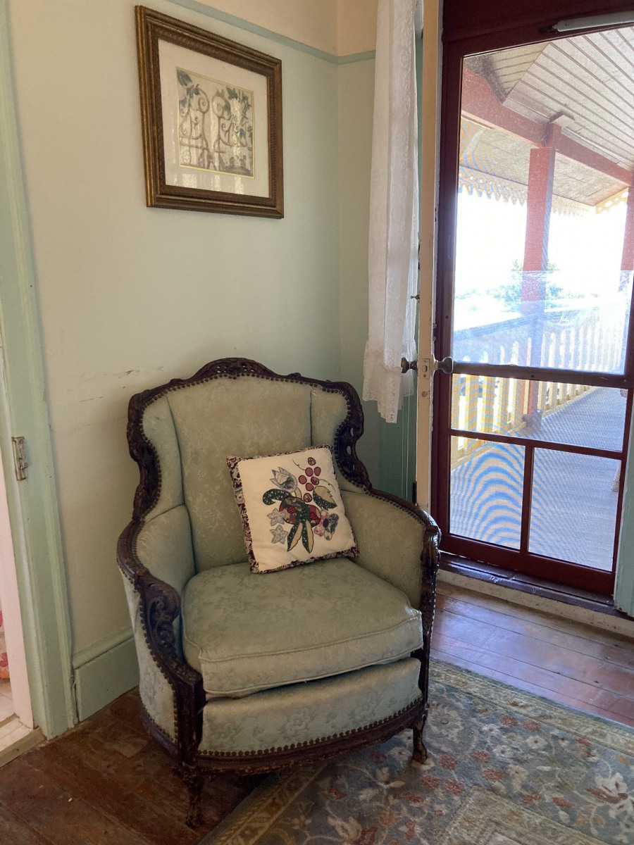The Cadet room is on the side of the house. There are two huge windows & a private covered porch. There is a queen size bed & two twin beds. There is a private bathroom.