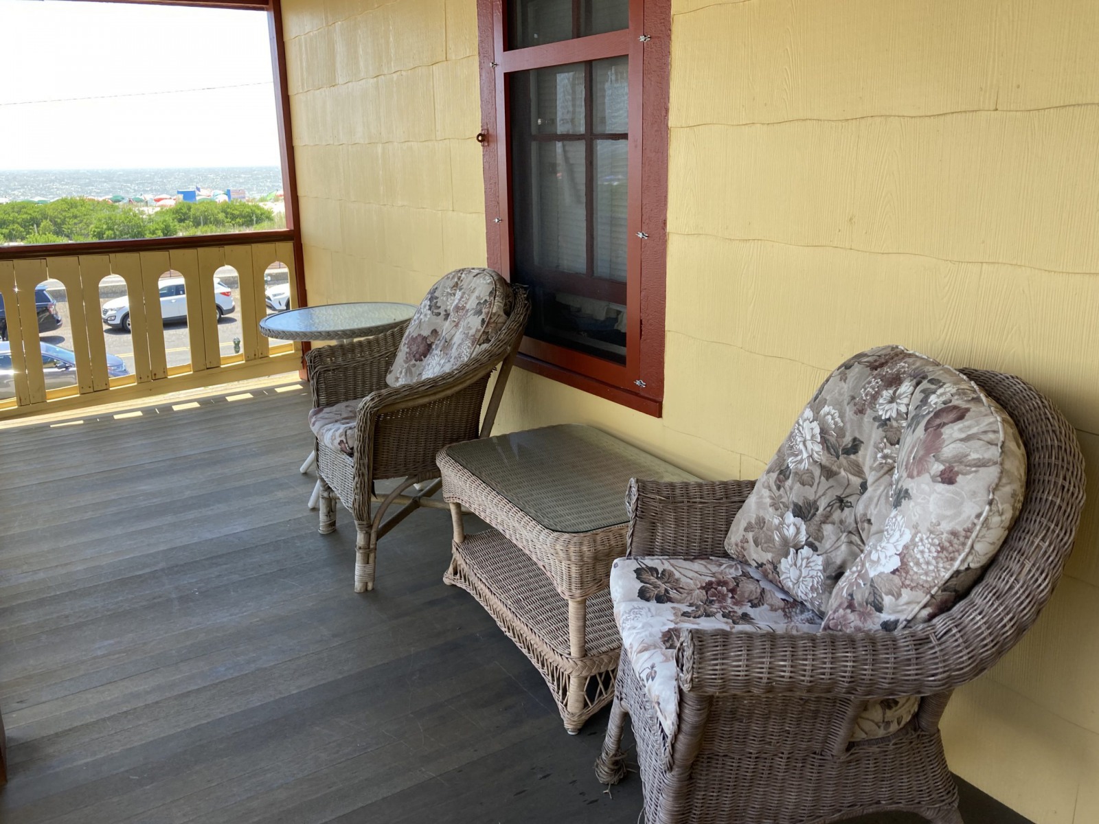 The Starboard room is at the back of the second floor with two huge windows and an open air porch with oceanfront views. There is a queen size bed & two twin beds. The bathroom is in the hall with a bathtub and shower, shared by the Starboard and Port.
