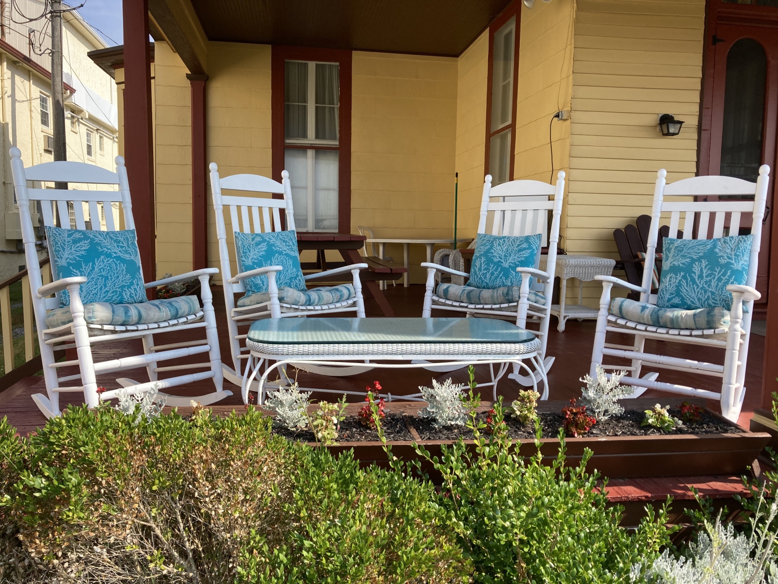 The May Caper is known for oceanfront views & breezes as well as our delightful wrap around front porch. Have breakfast or lunch on a wicker table, rock in a rocking chair, or have dinner around our large picnic table with seating for 10. The house has six bedrooms, five bathrooms & two balconies.