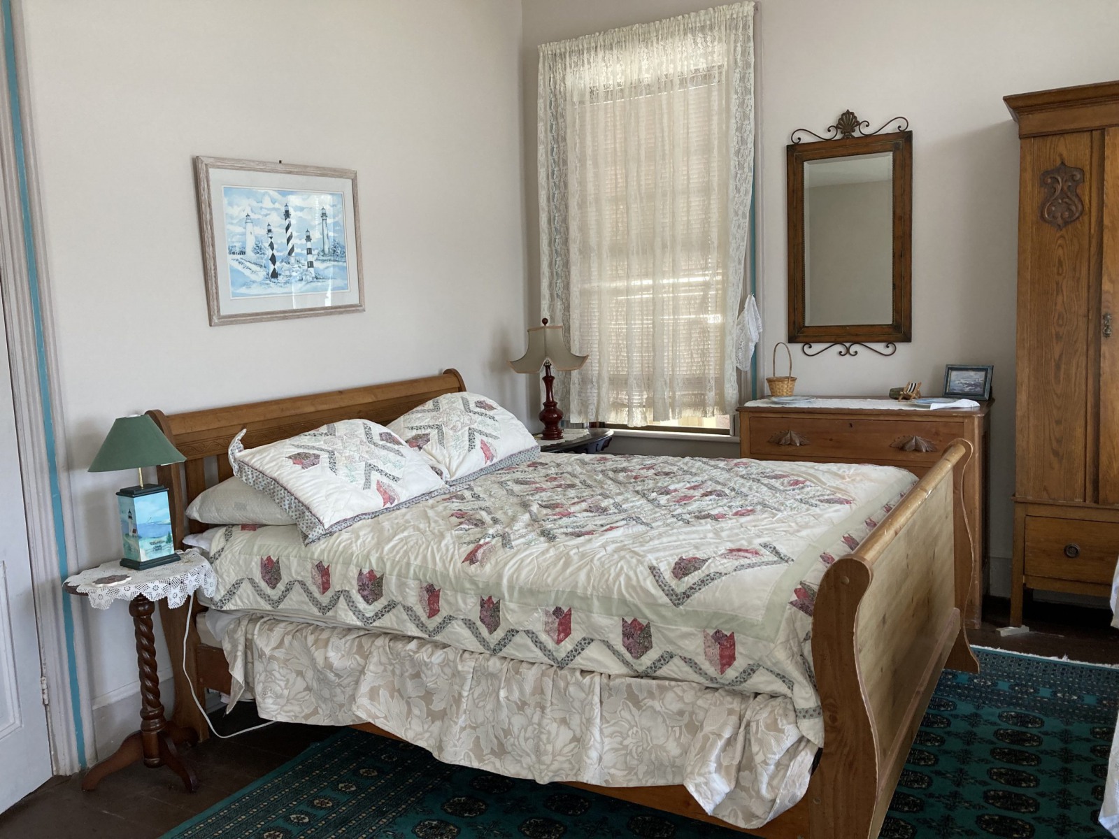 The Cadet room is on the side of the house. There are two huge windows & a private covered porch. There is a queen size bed & two twin beds. There is a private bathroom.