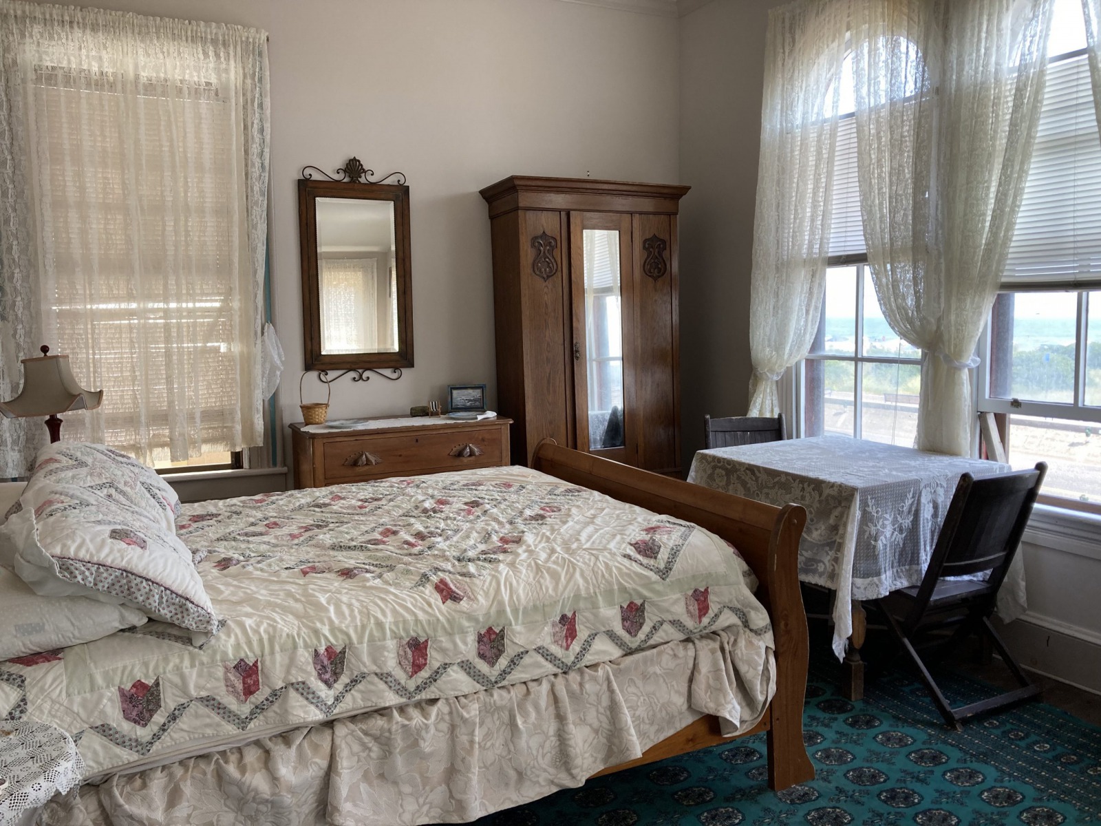 The Cadet room is on the side of the house. There are two huge windows & a private covered porch. There is a queen size bed & two twin beds. There is a private bathroom.